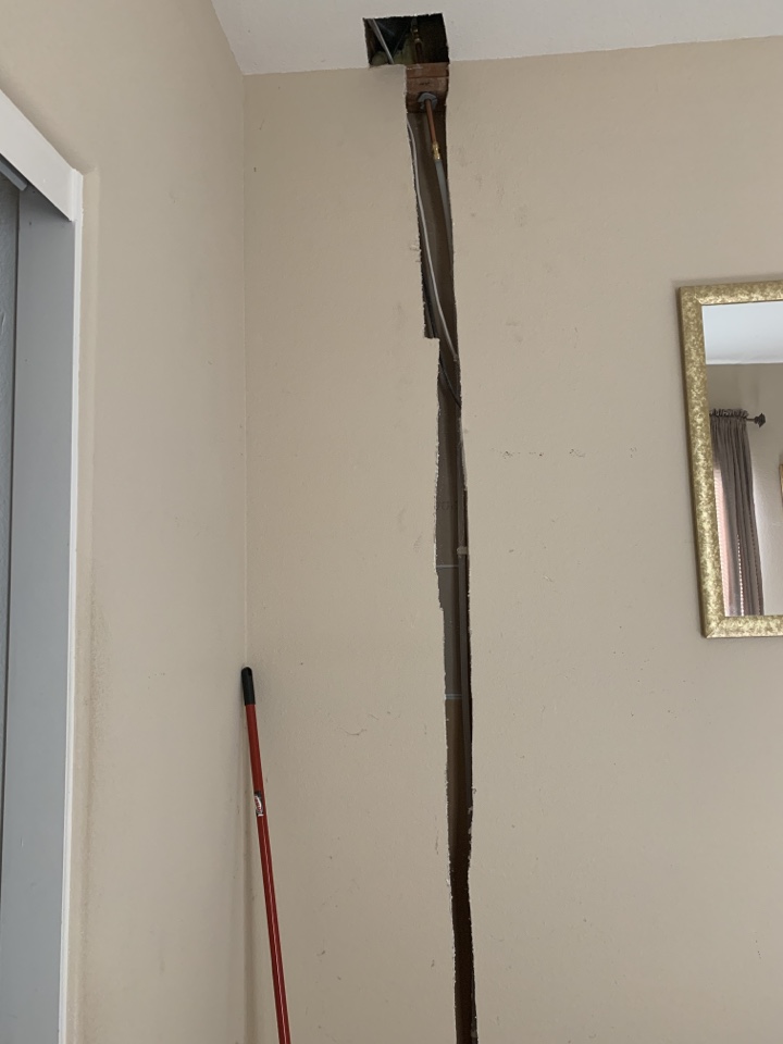 Drywall was found to be cut open for a plumbing repair. No evidence of any leaks but will recommend further evaluation by a licensed plumber and for the new buyer to ask the seller about the repair.