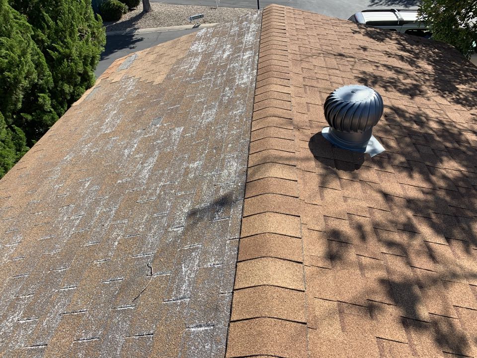 Mobile home garage roof inspection reveals that only one half of the garage roof was replaced. The roof material on half of the garage roof is worn and appears to be at the end of it useful life.
