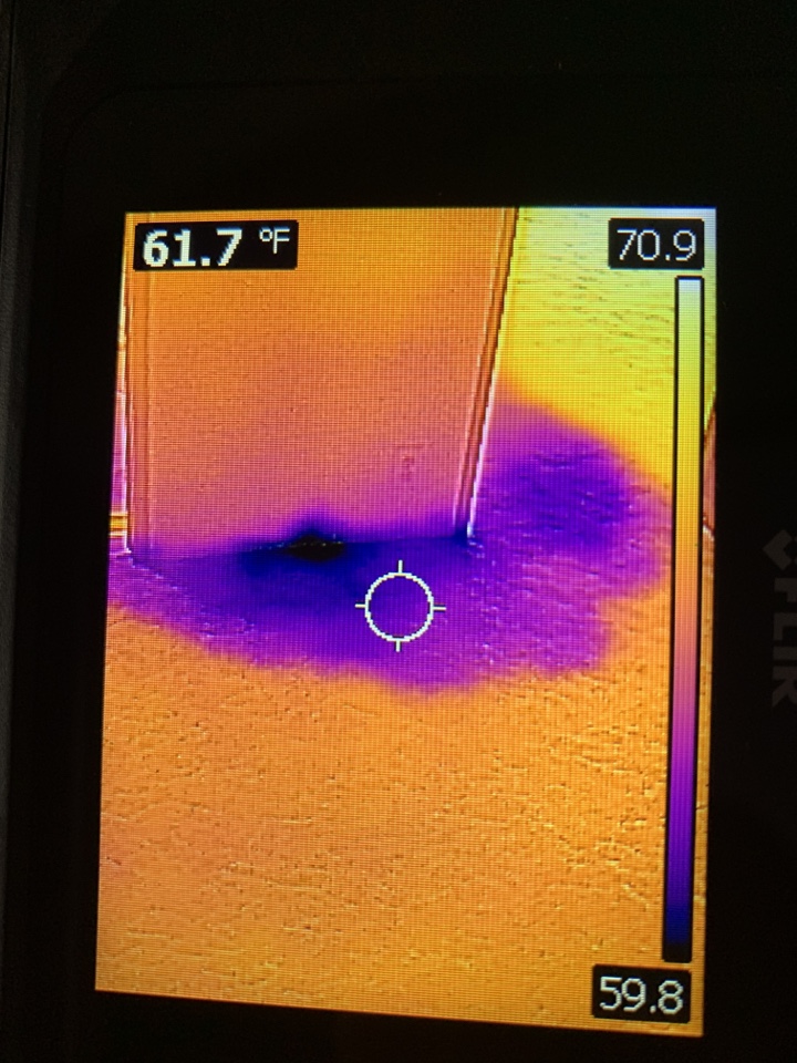 Toilet found to be leaking and water spread into four different areas/ rooms. The leak is not visible until these areas to include around the toilet was scanned using the C2 thermal camera. Great catch!!! Please inspect us at TPIPS.com or call 760-525-5340 for more info.